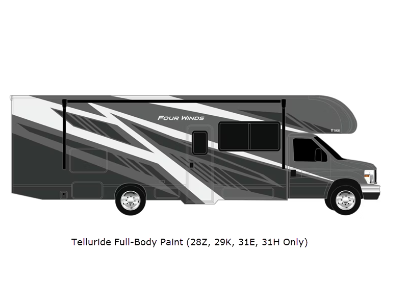 Sleeps 6 Slides 1 Length 30 ft Ext Width 8 ft 3 in Ext Height 11 ft Int Height 7 ft Interior Color Nantucket Blue ll, Sunlit Silver Exterior Color Standard Graphics. Optional Full-Body Paint; Durango, Telluride Hitch Weight 8000 lbs GVWR 14500 lbs Fresh Water Capacity 40 gals Grey Water Capacity 40 gals Black Water Capacity 27 gals Furnace BTU 30000 btu Generator 4.0 kW Gas Fuel Type Gasoline Engine 7.3L V8 Chassis Ford E Series Horsepower 325 hp Fuel Capacity 55 gals Wheelbase 212 in Number Of Bunks 1 Available Beds RV Queen Torque 450 ft-lb Refrigerator Type 12V w/Auto Generator Start Cooktop Burners 3 Shower Size 24" x 36" Number of Awnings 1 LP Tank Capacity 40.9 lbs Water Heater Type Tankless AC BTU 15000 btu Basement Storage 104.2 cu. ft. TV Info Mid-Ship 40" Smart TV Awning Info 14' Power w/Integrated LED Lighting Gross Combined Weight 22000 lbs Shower Type Standard Electrical Service 30 amp Solar Wattage 100 watts Similar Floorplans